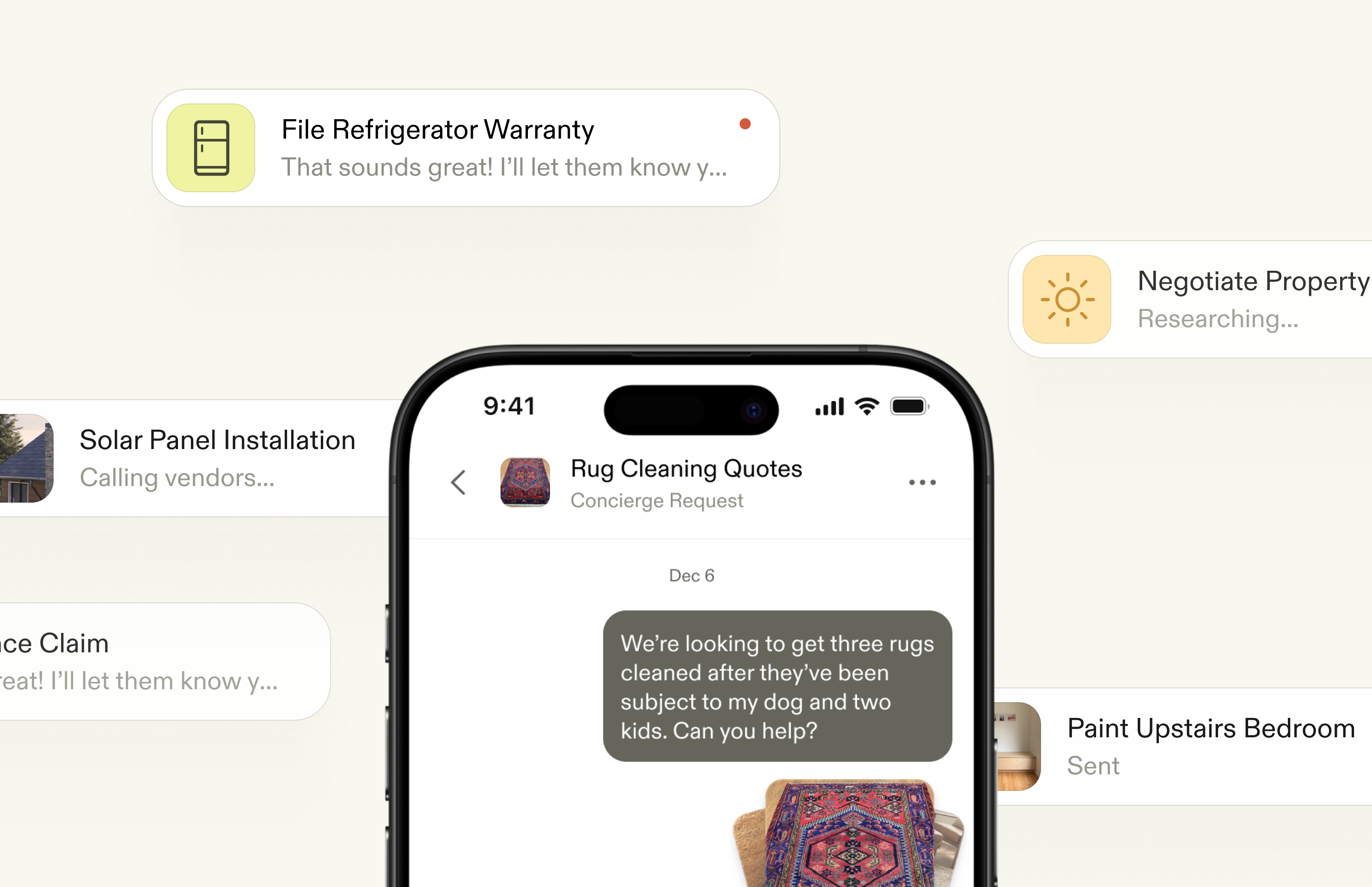 Rug cleaning quotes, solar panel bids, warranty claims, vendor negotiations — your concierge handles the whole list.